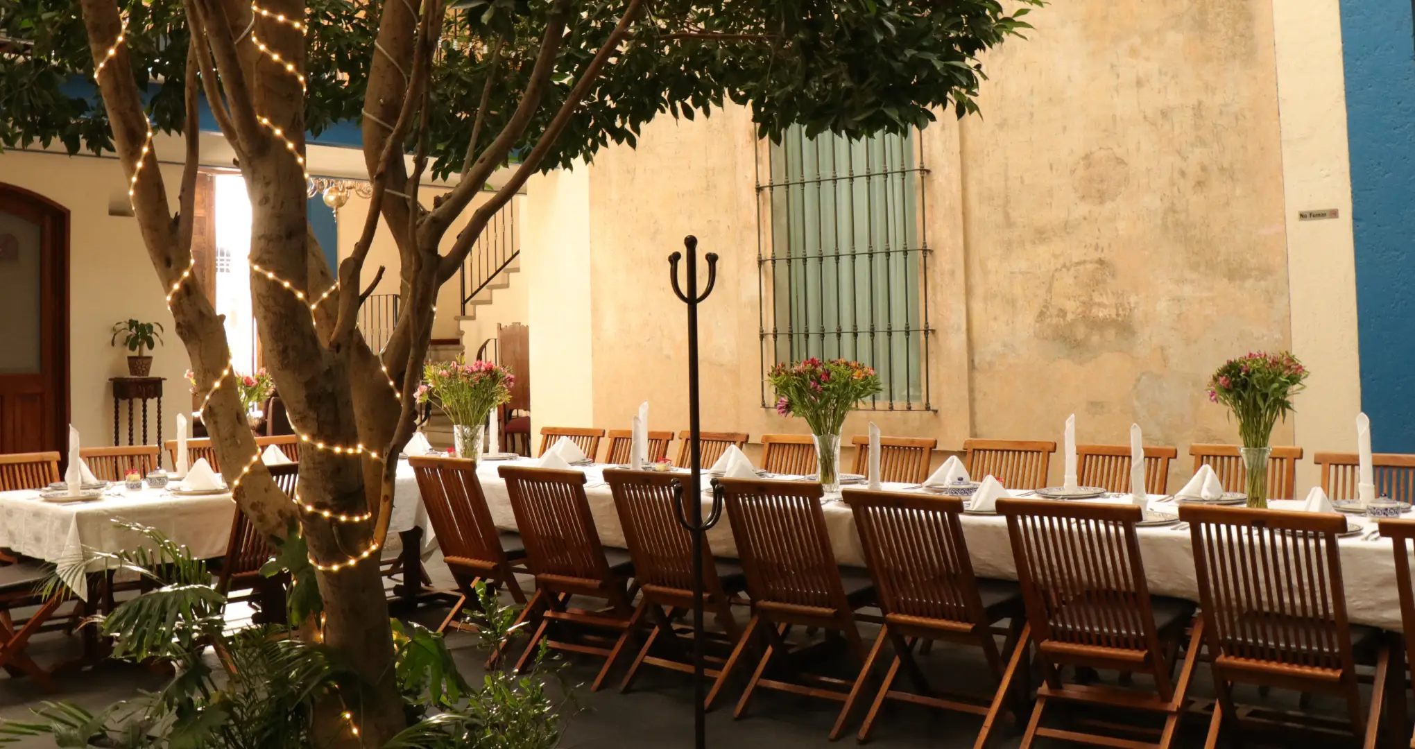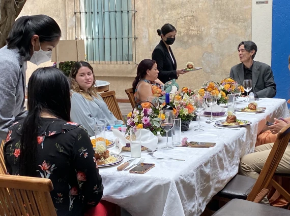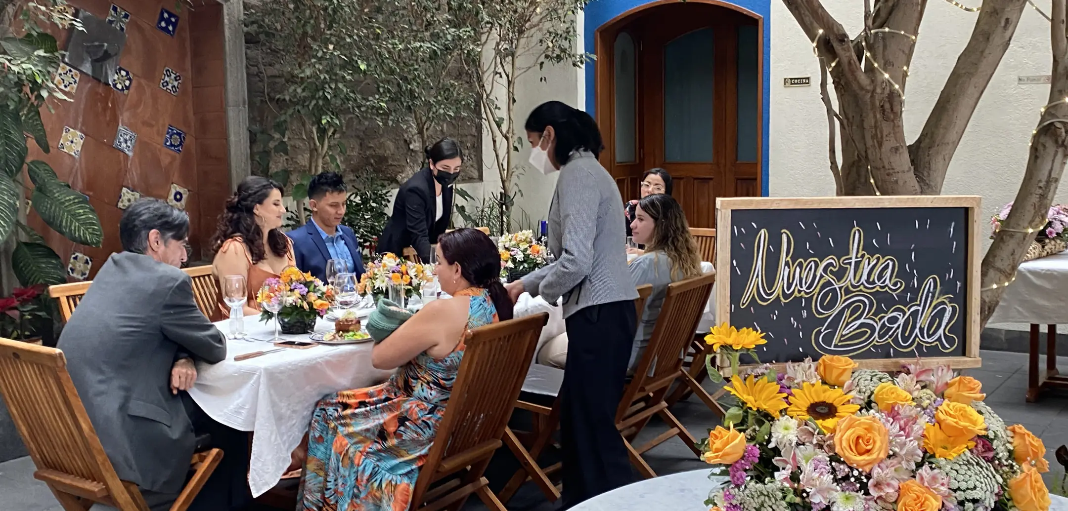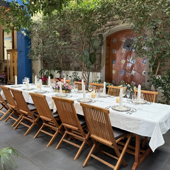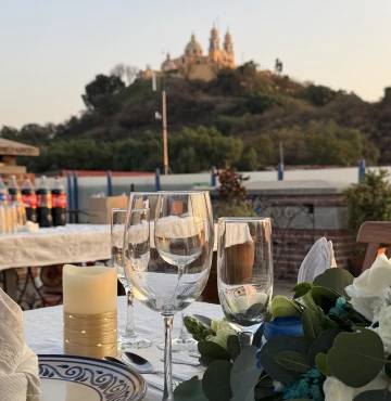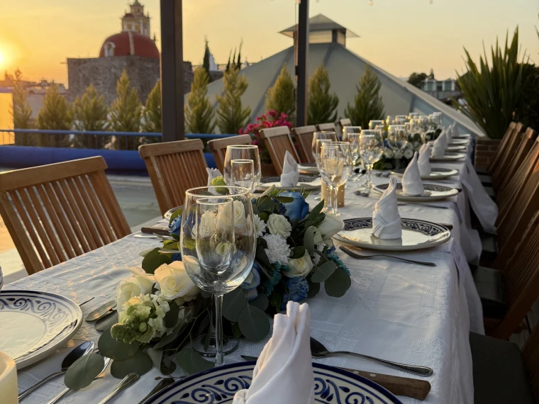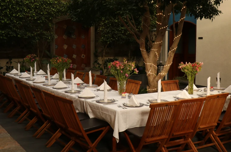 Ya sea una celebración íntima, un banquete familiar o una reunión empresarial, nuestros espacios coloniales -El Patio de la fuente de talavera (hasta 45 personas), el Área del piano (hasta 12 personas) o la Terraza con vista a la pirámide (20–25 personas)- ofrecen el escenario perfecto para compartir momentos único.